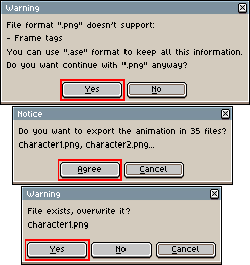 Once you have finished editing your character's sprites, it's time to export all animation frames into different numbered .png files.