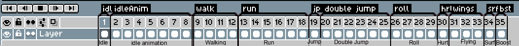 PSA: Do not add or delete animation frames for ANY animation, as that will mess up with the animation frames' indexes for custom characters internally, keep the whole file at 35 frames.