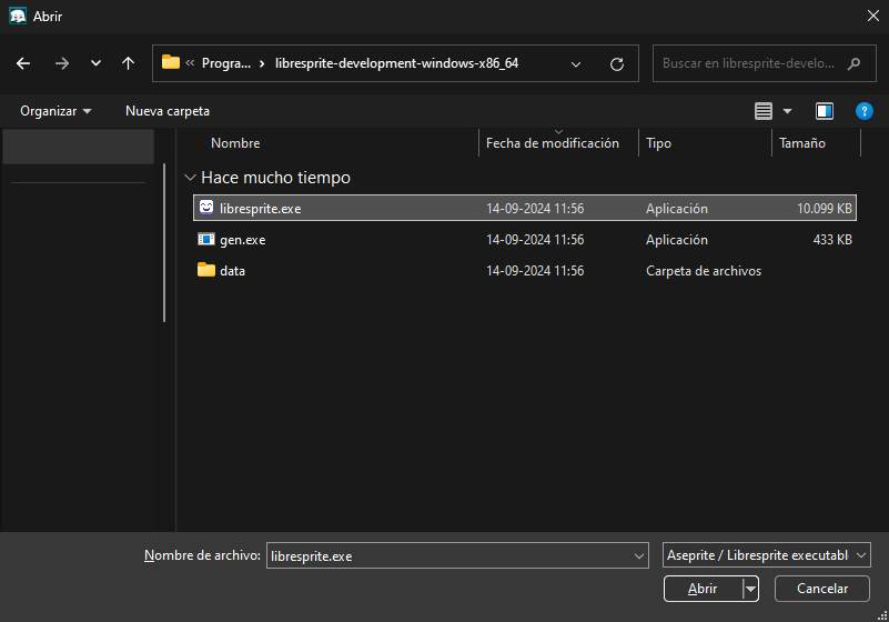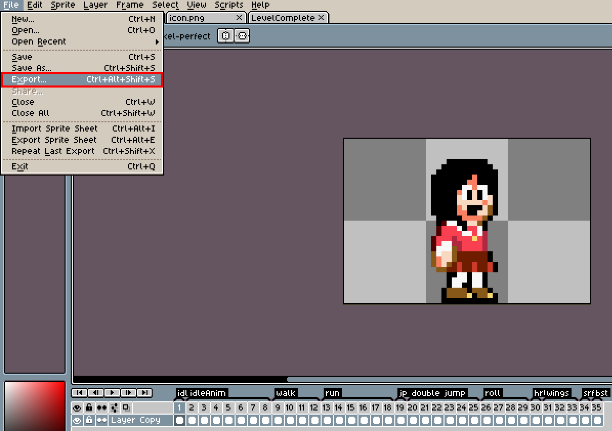 So go to File > Export on Aseprite and click on it (or press Ctrl+Alt+Shift+S)