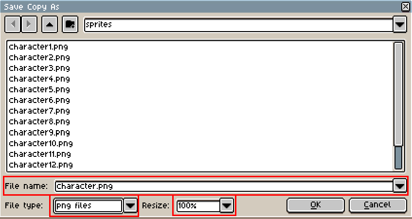 This window will pop-up, make sure to set File name as character.png, File type to png files and Resize to 100%.