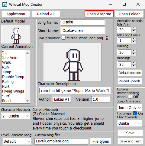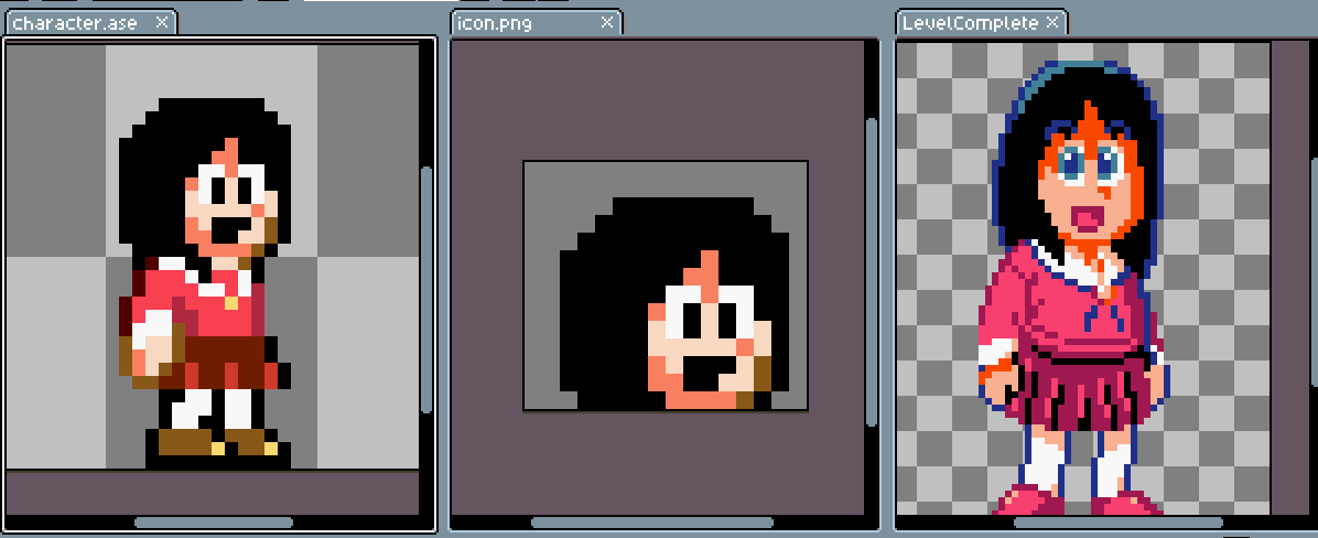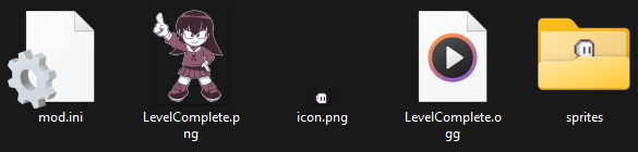 - These are pretty self-explanatory; "character.ase" is your character's sprites, "icon.png" is your character's life icon, and "LevelComplete.png" is your character's level complete sprite.