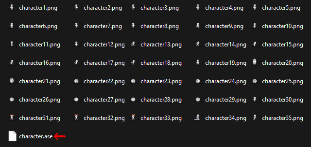 These are lots of files, I know, but the only one you have to care about is "character.ase", this is the file you'll open with Aseprite or Libresprite to get your character's sprites in-game.